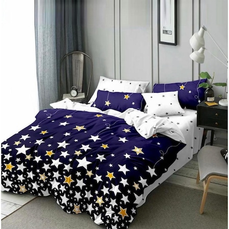 Двойно спално бельо, сатен памук супериор, 4 части, чаршаф 200x230, чаршаф 240x250, калъфки за възглавници 55x75 см, Pucioasa Elegant, звезди, синьо/бяло/жълто, BBC 021